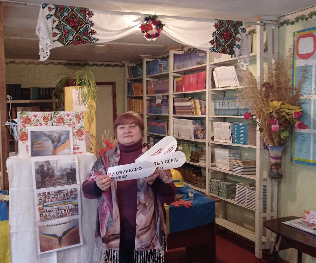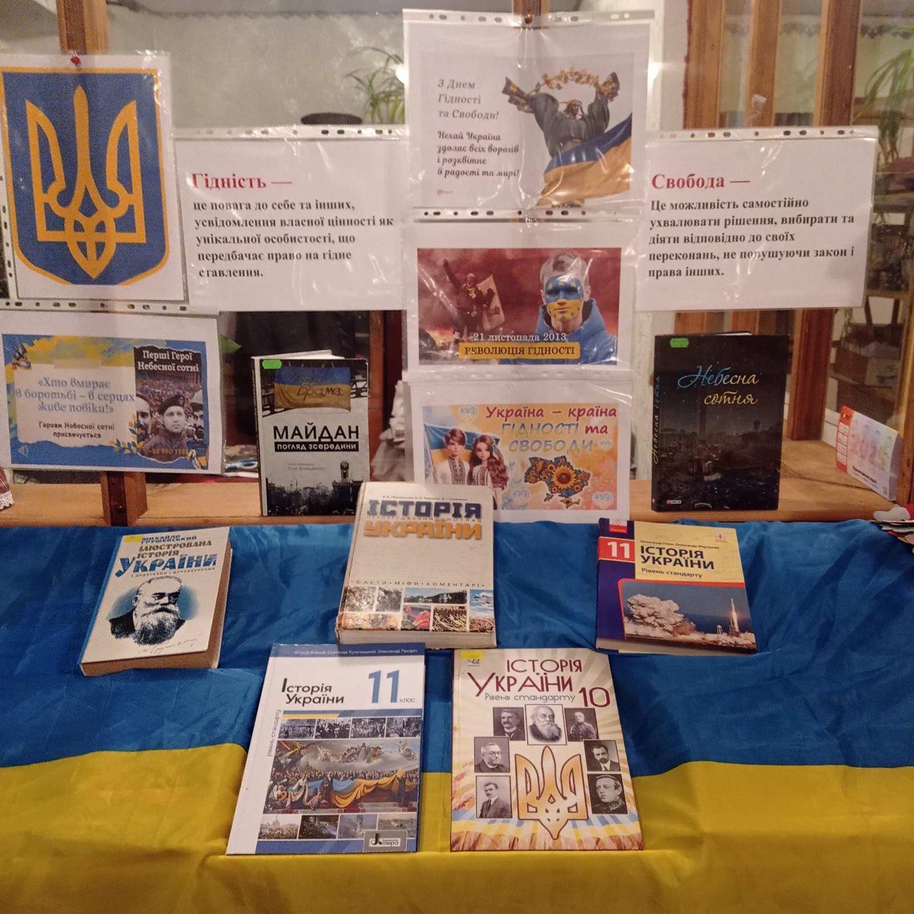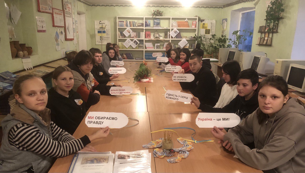 Бібліотекар ДНЗ “Крижопільський професійний будівельний ліцей” Тетяна Петрівна Лісоволик з метою ознайомлення студентів з історією країни, пояснення понять “гідність” та “свобода”, формуванням усвідомлення єдності України, вихованням патріотизму, вшанування пам’яті героїв, що віддали своє життя за Свободу та Гідність Батьківщини підготувала та провела зі студентами годину пам’яті “Хто вмирає в боротьбі – в серцях живе повіки!”